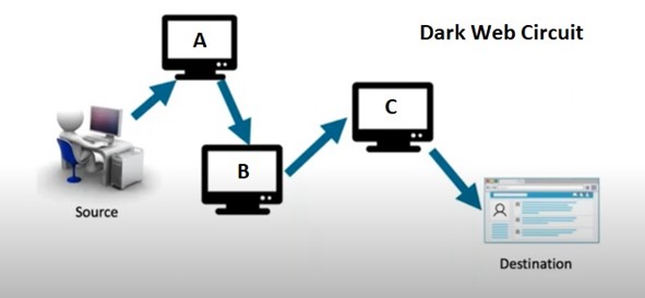 The image above shows you an example of a dark web circuit and how it goes through multiple computers to get to the destination.