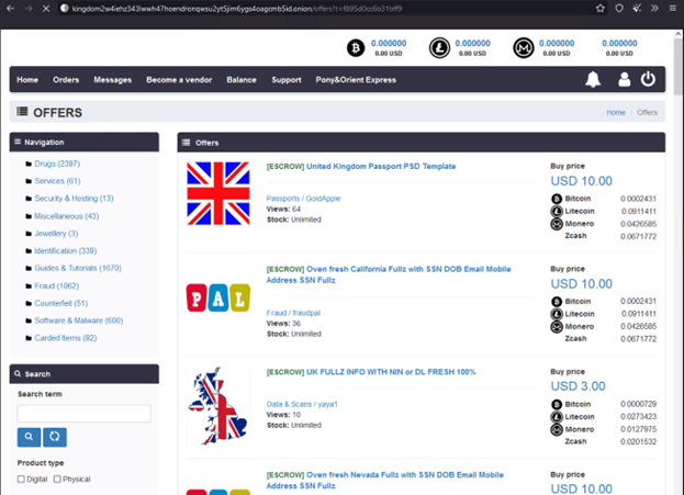 All this information is well and good, but we bet you’d like to take a peek at the dark web. So, let’s dive right in! Our first stop is the Kingdom marketplace. Below is a screenshot of fresh full data profiles and UK passport templates with prices ranging from $3 – $10.