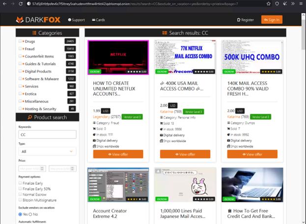 Our next stop is the DarkFox marketplace with images of email addresses, account creation tools, and hacking advice for sale.