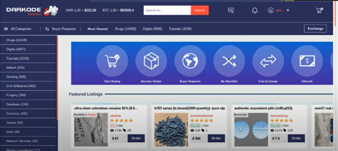 Our final stop is the DarkOde marketplace. In this screenshot you see listings for drugs rather than stolen information. You may notice that all three of these sites look quite similar to a regular clear web e-commerce site, just with illegal products. There are advanced search features, notifications, and customer service buttons, which make it easy for the criminal community to shop the markets.