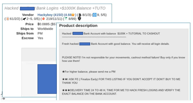 To provide visibility into the listings themselves, we have an example of the additional information you can find once you click on a listing. In the next image below, you can see an ad on another site selling bulk bank logins. These sample images don’t capture the full range of products available in dark web marketplaces. Criminals also sell hacking tools, access information, and even offer their services—complete with their hacking resume. Watch this video on exposure extortion or read The 4 Top Cybersecurity Threats of 2022 to see more dark web extortion sites.